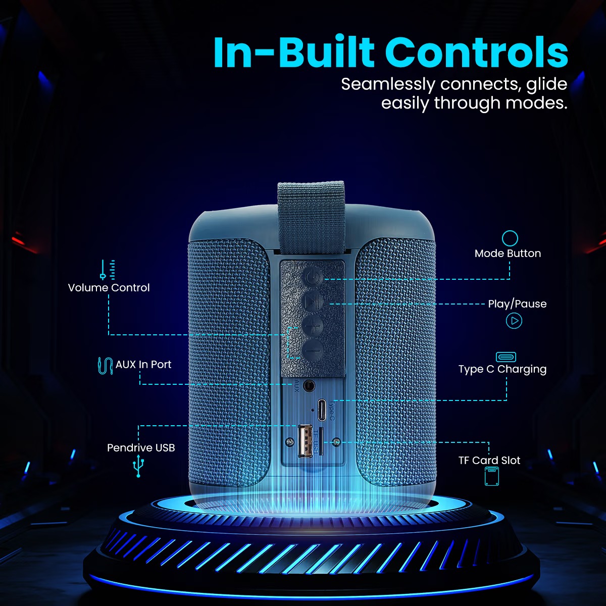 • Type-C Charging: Since we love to stay upbeat with new technological upgrades, Sound Drum P stays ahead on this instance, with its Type C charging port. This allows for a wide compatibility not only in matters of connectivity but also charging.