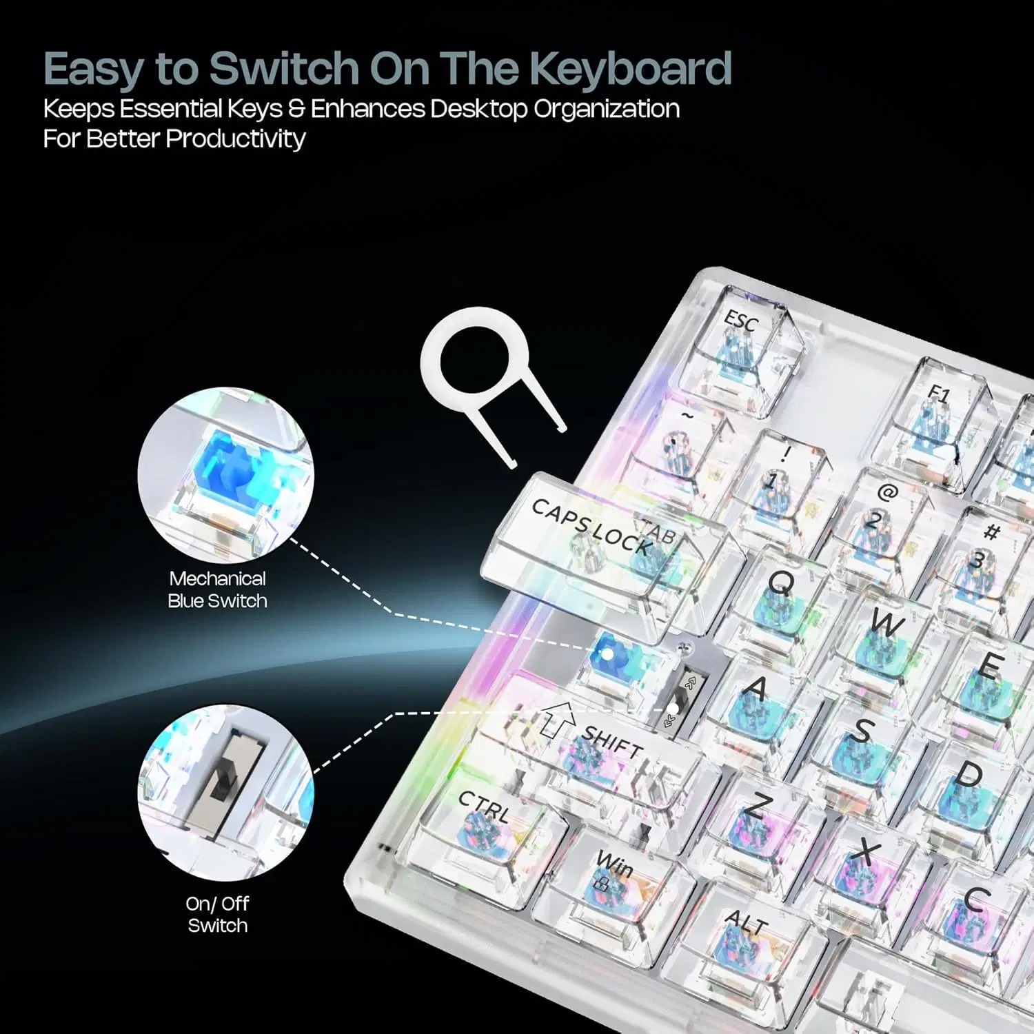 Stunning Transparent Keycaps & Body – Designed with a fully transparent keycap and body, this keyboard enhances the RGB lighting effect, offering a sleek, futuristic look that stands out in any setup while maintaining exceptional durability and visibility